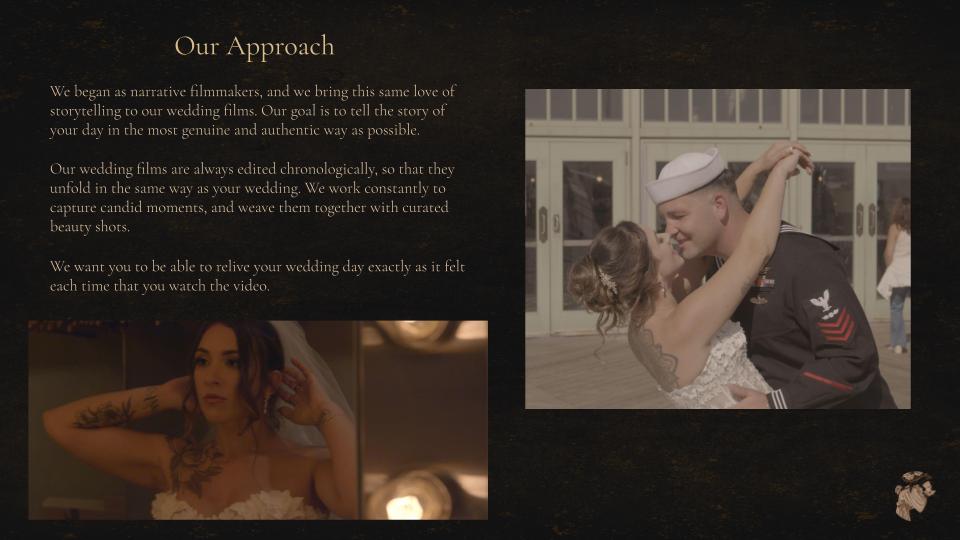 We started in narrative filmmaking, and we bring cinematic filmmaking sensibilities to our wedding films. We are comfortable in low light, we frame our shots just like we would in narrative work, and we specialize in musical, energetic editing.