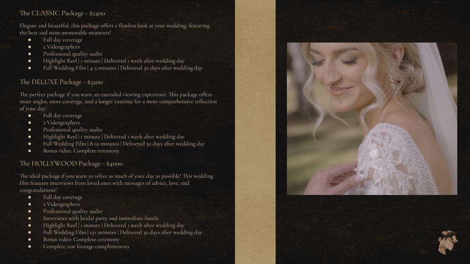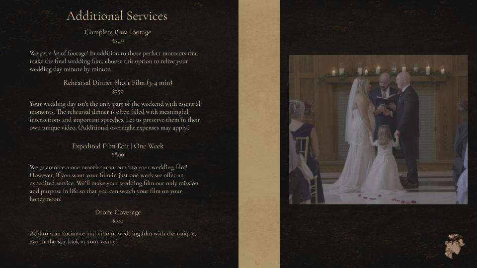 Your wedding day is one of the most unique days of your entire life. Our packages offer a range of options, such as two videographers, your full ceremony, and the complete RAW footage, to ensure that you get the most beautiful and comprehensive coverage possible.